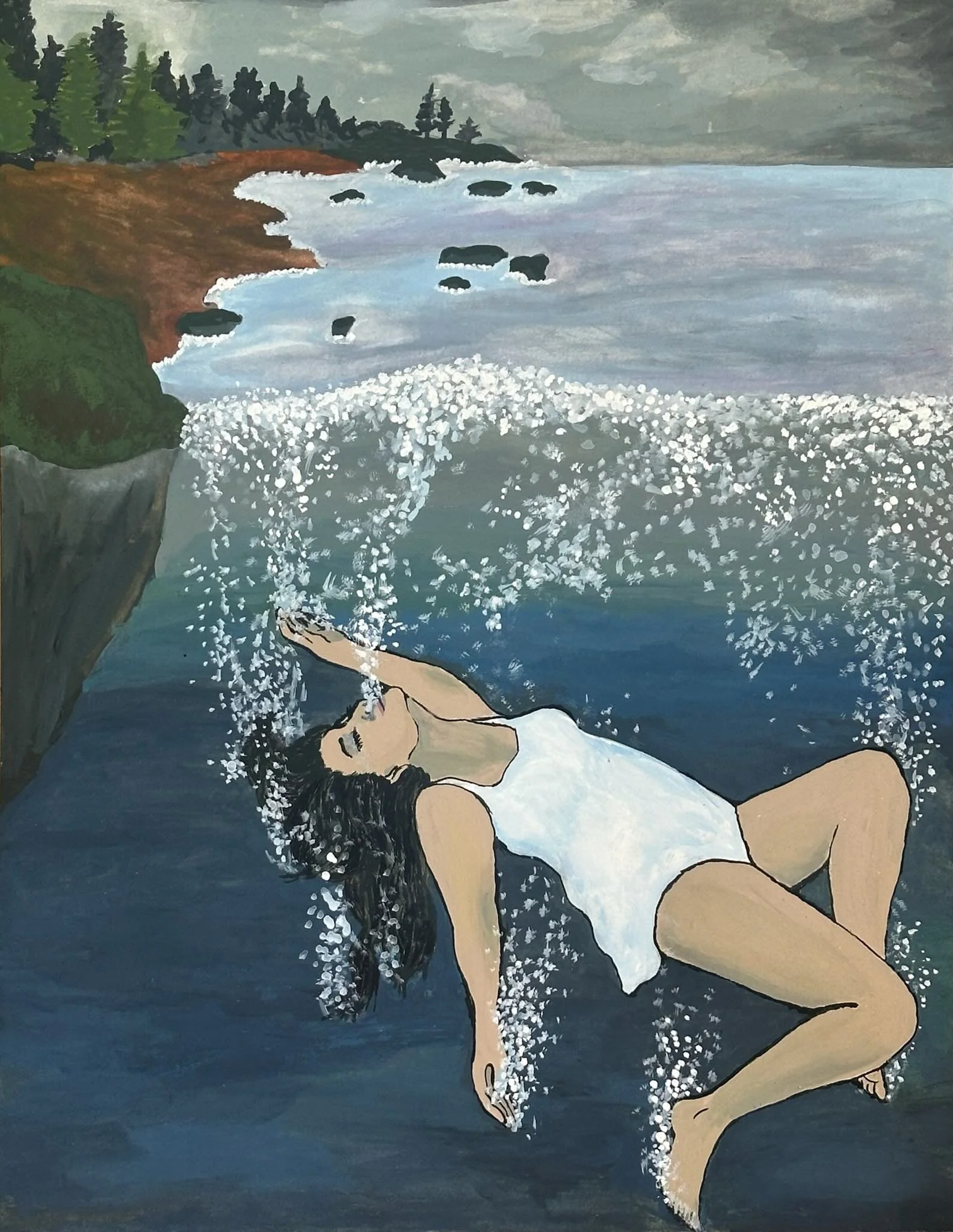 Nicolette Lēcy (国志高)Painted in subdued, earthy tones, Ocean Escape evokes both the stillness and gravity of surrender. The landscape—reduced to faint trees and a distant shoreline—gives way to an expanse of cold, enveloping water. Within it, Yu (Beth) drifts downward, eyes closed, limbs slack, bubbles rising softly to the surface. The gouache medium lends a dense, velvety texture that heightens the sense of immersion, capturing the moment she yields to the depths. Through its muted palette and careful restraint, the work transforms a vision of descent into a meditation on release—where escape feels at once haunting and serene.